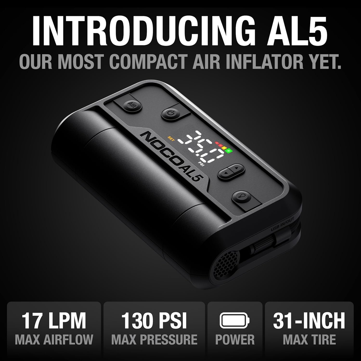 - ALL-NEW AL5 — Our most compact, cordless air inflator ever. Battery powered for total portability – delivering 17 SLPM of airflow to inflate car tires, bikes, sports gear, and more. Designed for tires up to 31 inches.